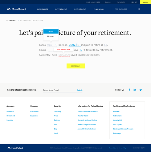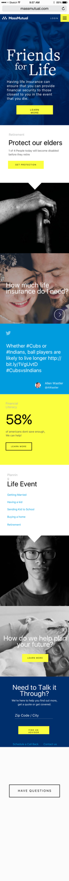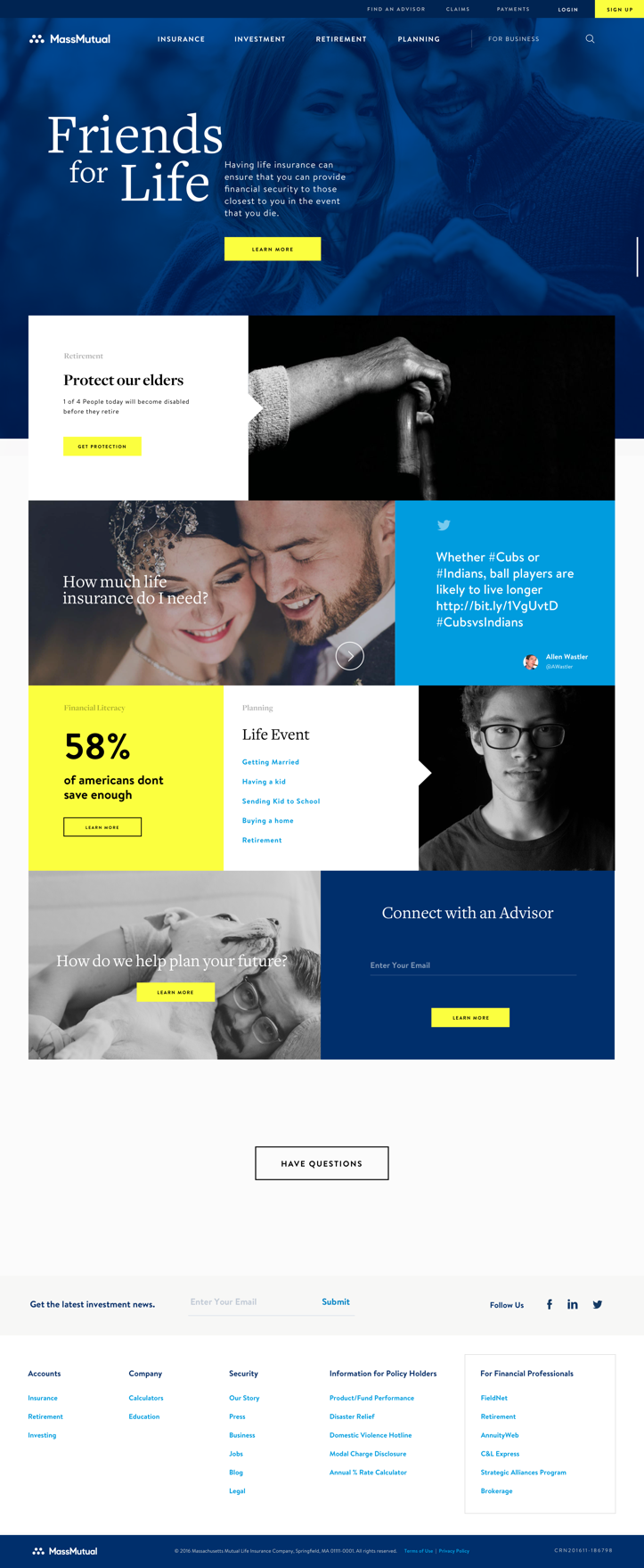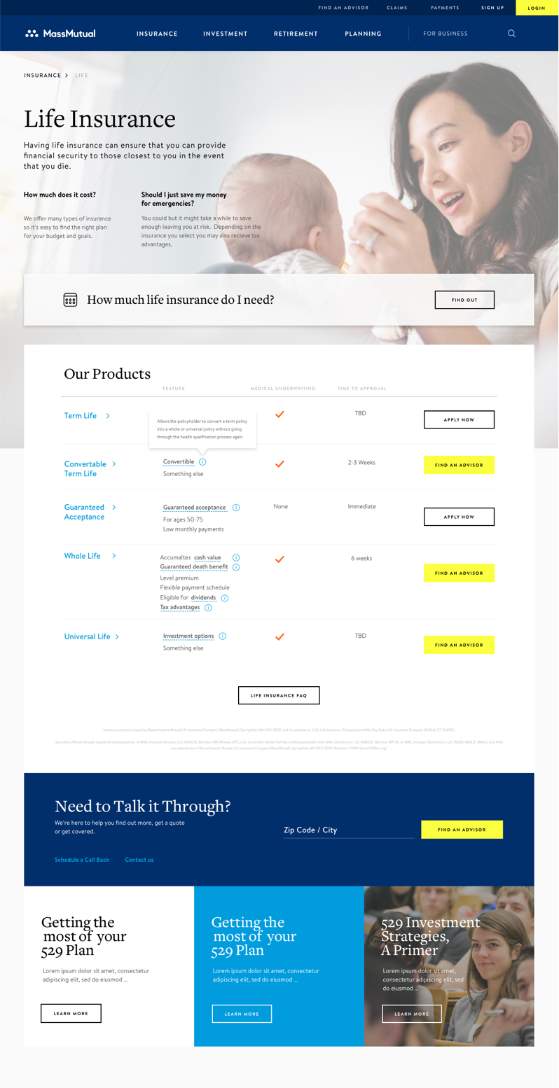 After weeks of exploration we landed in a place where our concepts started resonating with the MM management team. The following homepage was approved and was the first version of the Homepage to launch under the New Mass Mutual Brand. Thanking had been done in the UI to design a clean and easy to use navigation and provide pathways into the most important content areas of the new site.